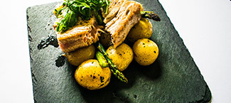 - Either baby new potatoes dressed in fresh herb butter, roasted baby new potatoes with garlic, thyme and rosemary or freshly cooked jacket potatoes